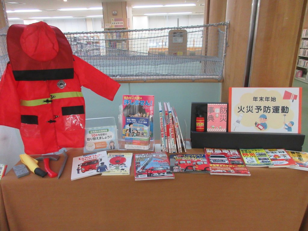 消防との連携展示です。年末年始火災予防運動にあわせて、防火・防災に関する本や消火器具に関する本、消防に関する絵本などを展示しています。