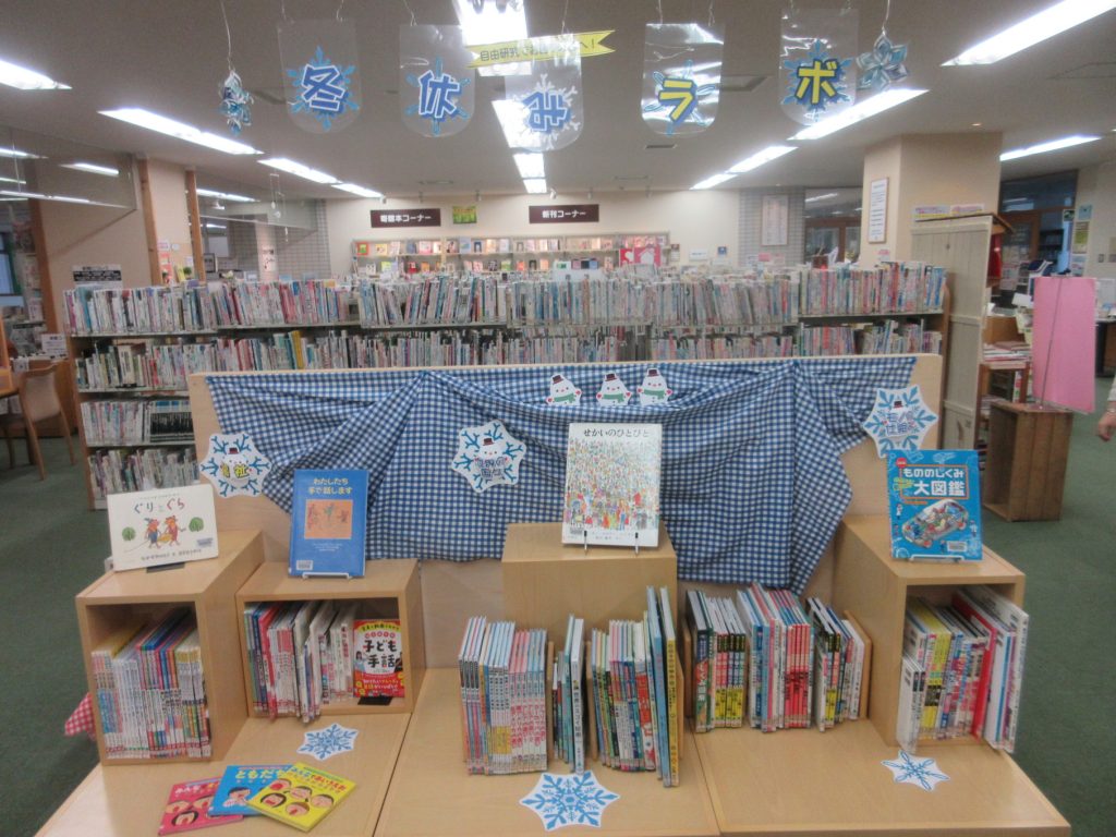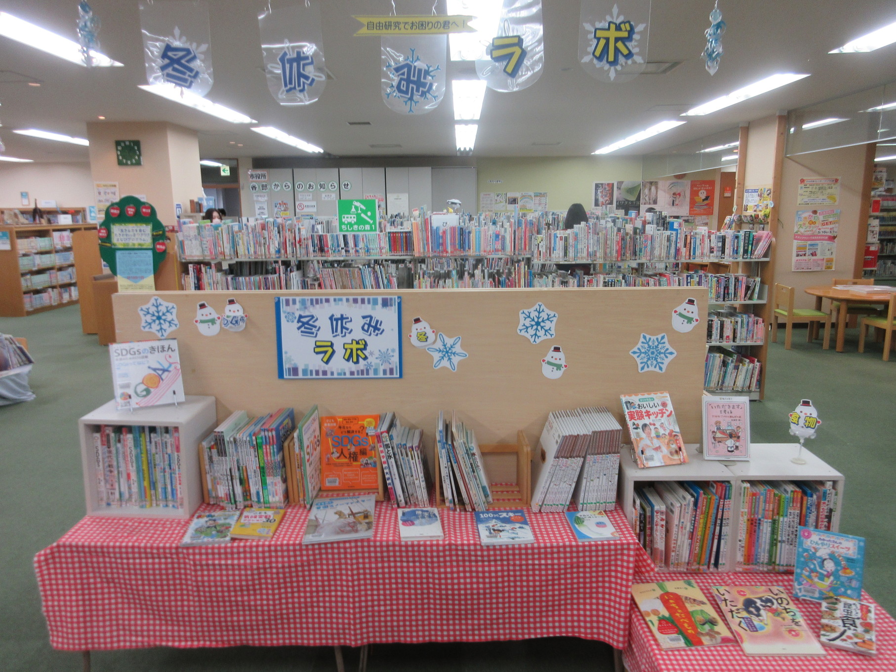 図書館では冬休みの宿題に参考になる本を集めて展示しています。「SDGs」「冬」「食物」「福祉」「世界の国々」「モノの仕組み」等、テーマに分けて展示しています。ぜひご覧ください。