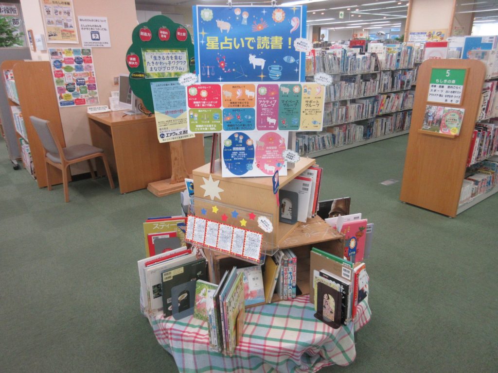 図書館では星座に関する本や、星座ごとの性格に合った職業などの本を展示しております。合わせて各星座の特性が書かれたお持ち帰りいただけるカードもご用意しております。ぜひご覧ください。
