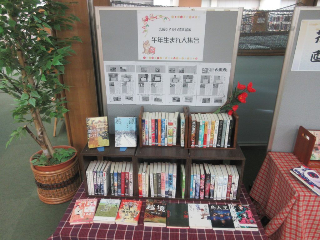 広報たきかわ1月号の特集は、「午年生まれ大集合」です。特集に併せて、午年生まれの作家の本を集めて展示しています。