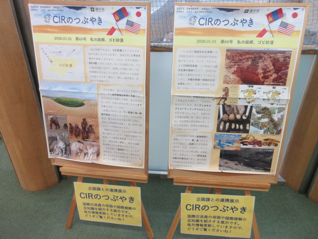滝川市の国際交流員のみなさんの活動をご紹介する展示「CIRのつぶやき」。この展示では、ゴビ砂漠について紹介してくれています。