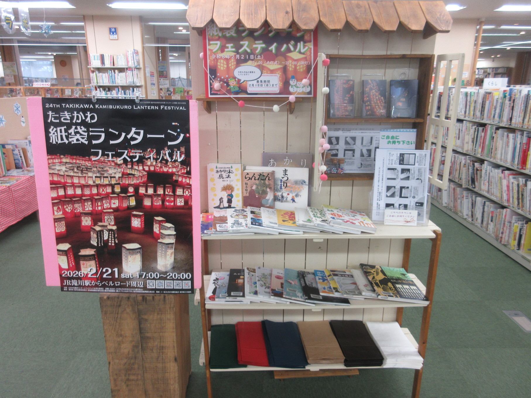 2026年2月21日開催の「第24回 たきかわ紙袋ランターンフェスティバル」に向けて展示を行っています。切り絵の本や、自由にお持ち帰りいただけるランターン用の紙袋やポストカードを用意しているので是非ご覧ください。