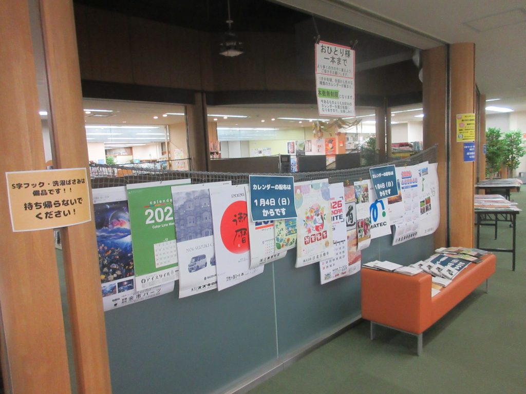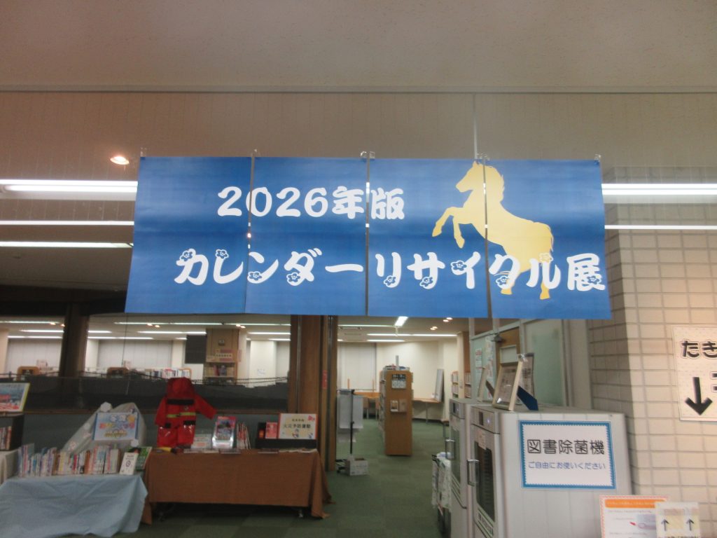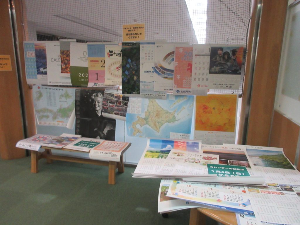 1月4日よりカレンダーリサイクル展を開催しております。図書館へご提供いただいたカレンダーを、ご希望の方に無償提供しております。おひとり様1本までです。(提供できるカレンダーの在庫数により変更します)