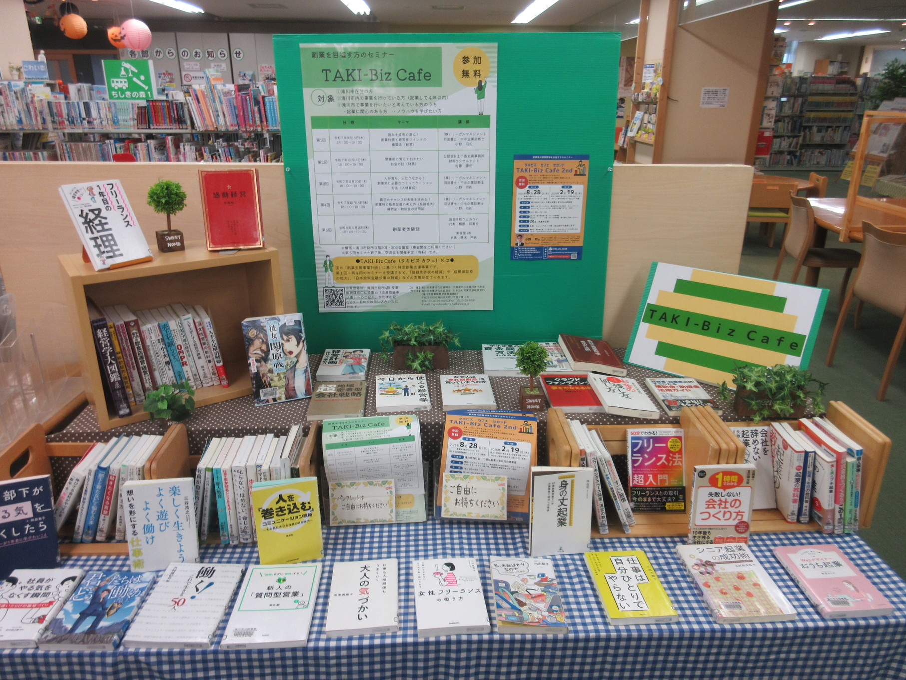 産業振興課企業連携係との連携展示です。「TAKI-Biz Cafe」に関連する展示や起業に役立つ本を展示しています。