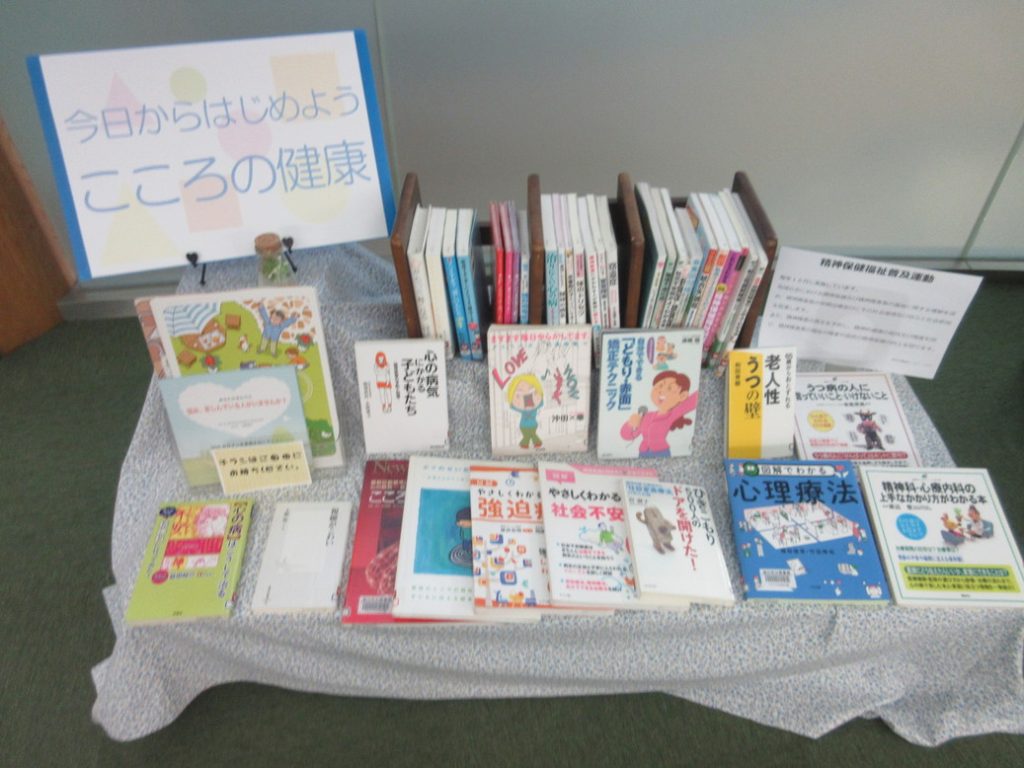 滝川保健所との連携展示です。うつ病、精神障害、心理療法、メンタルヘルスなどに関する本などを集めて展示しています。