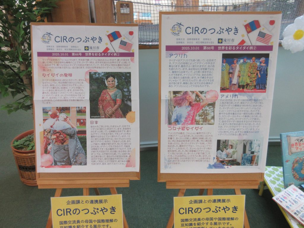 滝川市の国際交流員のみなさんの活動をご紹介する展示「CIRのつぶやき」。この展示では、世界を彩るタイダイ柄について紹介しています。