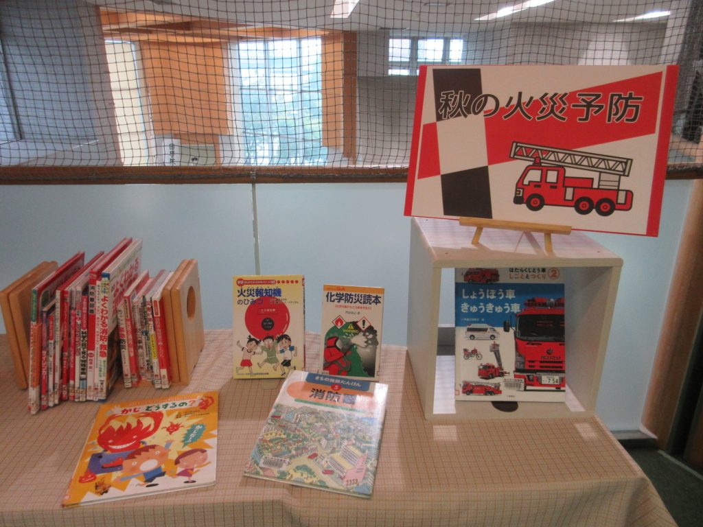 滝川消防署との連携展示です。火災予防や消防・救急に関する本を集めて展示しています。