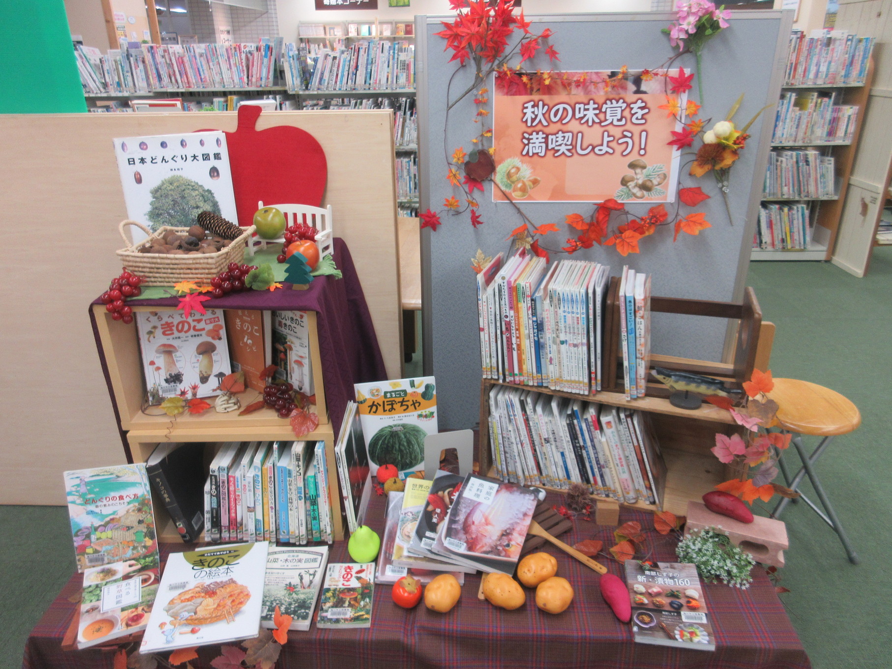 食欲の秋がやってきました。キノコや山菜、旬の野菜の図鑑やレシピ本、食べ物がテーマの絵本を集めて展示します。ぜひご覧ください。
