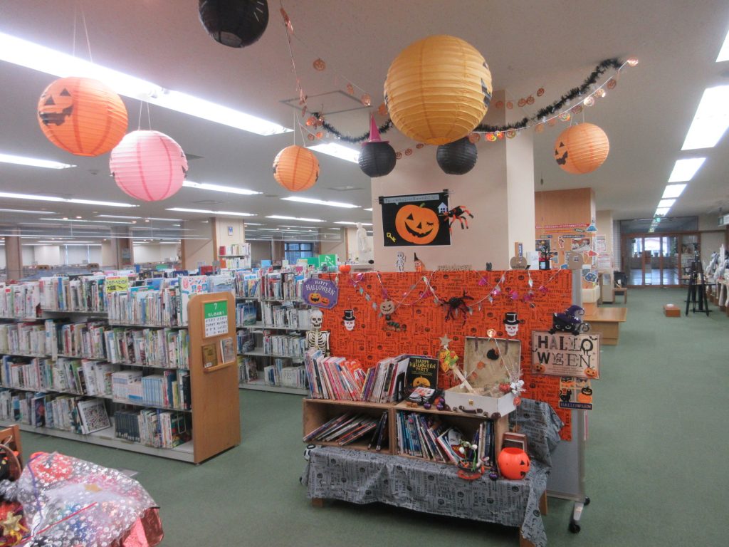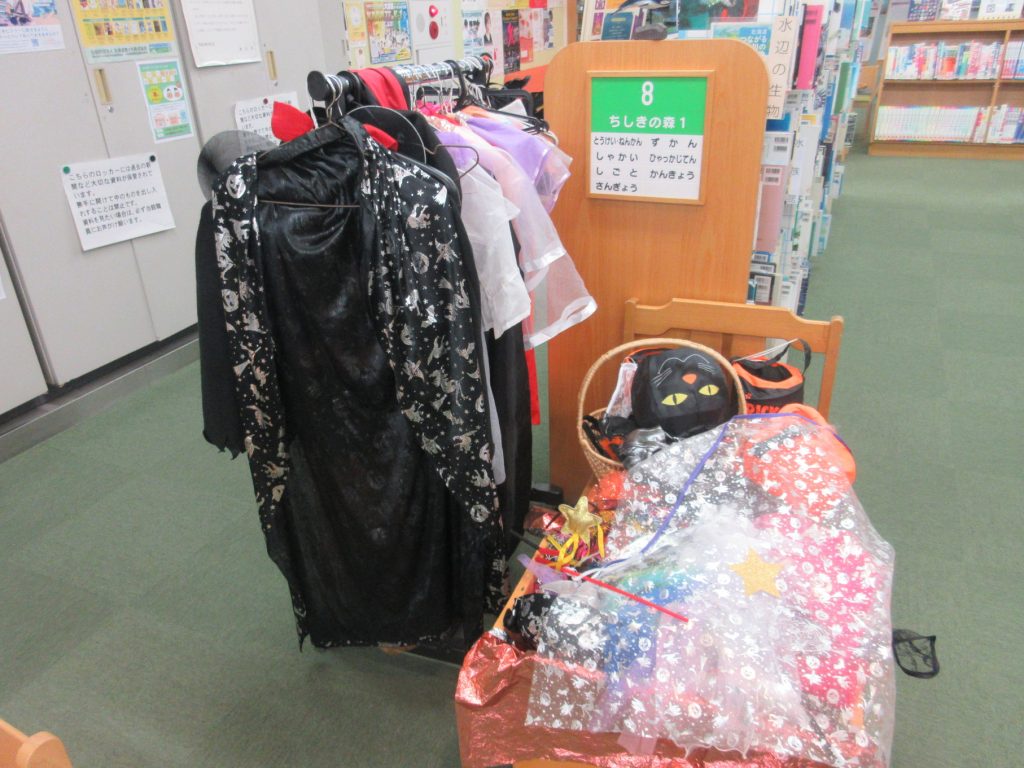 10月31日はハロウィンです。ハロウィンに関する本を集めて展示しています。また、仮装コーナーや写真撮影コーナーもあります。