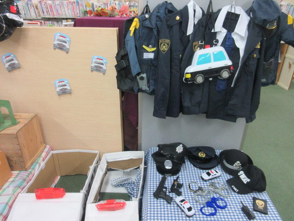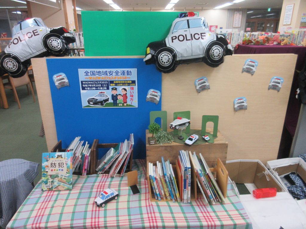 滝川警察署と空知自動車学校との連携展示です。9月21日~30日は秋の全国交通安全運動です。滝川市立図書館では、警察や防犯などの本を集めて展示しています。警察の制服や帽子、手錠、段ボールで制作したパトカーなどもご用意しています。ぜひ写真を撮りにお越しください!