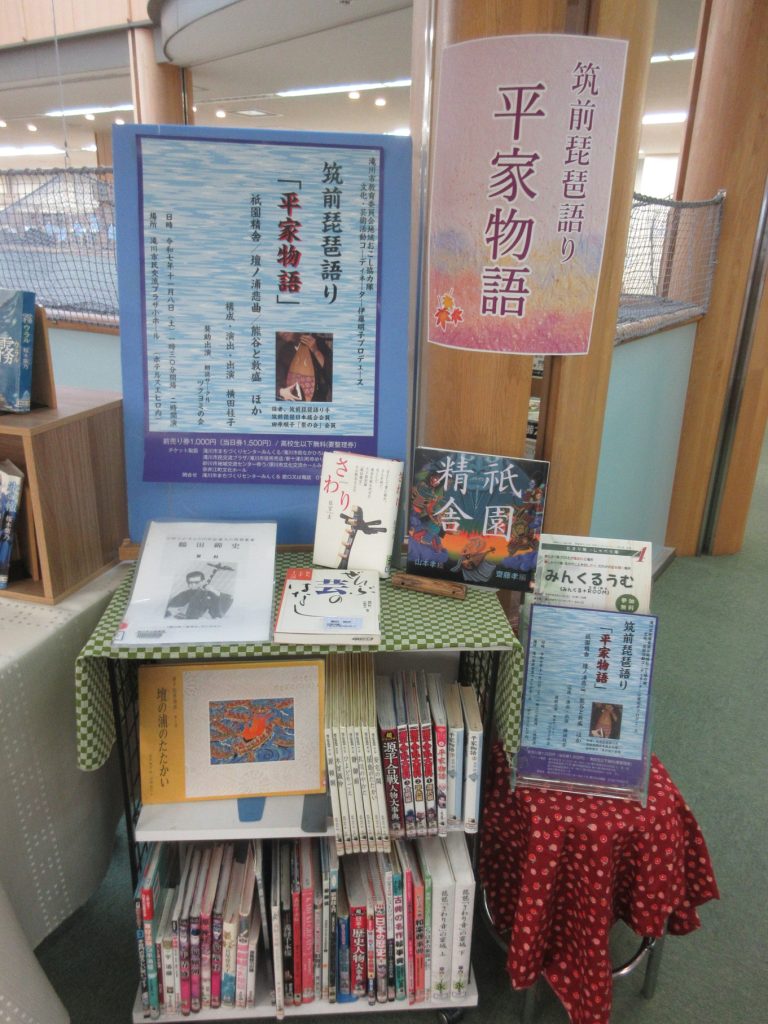 地域おこし協力隊との連携展示です。11月8日に滝川市民交流プラザホール(ホテルスエヒロ内)にて筑前琵琶語り「平家物語」が開催されます。あわせて平家物語に関する本を集めて展示しています。