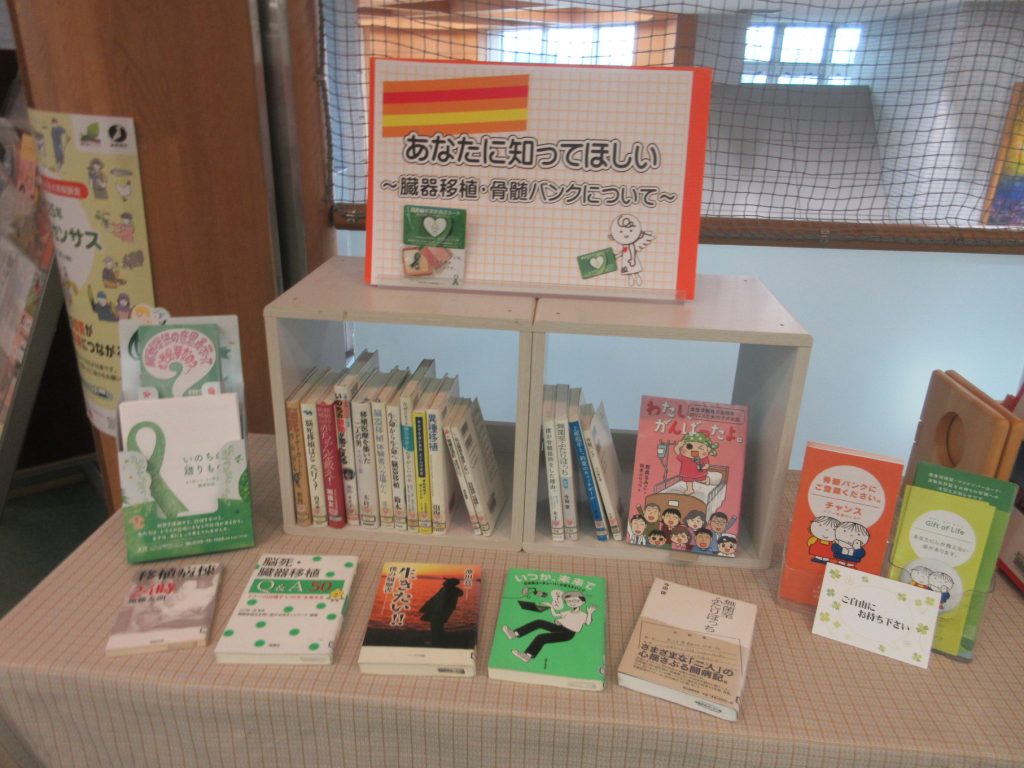 滝川保健所との連携展示です。臓器移植に関する本や骨髄バンクに関する本を展示しています。