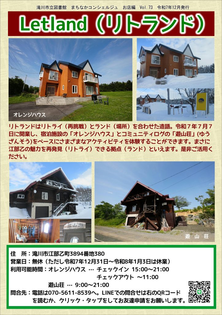 2025年12月25日 お知らせまちなかコンシェルジュ_お店編 No.73 Letland(リトランド) 2025年12月24日 お知らせ 生きる力を育むたきかわっ子ワクワクまなびプログラム「たきかわDE調べる学習体験講座・冬休み編」メディアコースが開催されました!! 2025年12月19日 ポスター・チラシ 新春お年玉プレゼント抽選会 2025年12月19日 ポスター・チラシ 駅カフェ 2025年12月17日 お知らせ 株式会社保工北海道様より本をご寄贈いただきました!! 2025年12月6日 ポスター・チラシ 滝川とともに駆ける JR北海道滝川駅 2025年12月1日 2025年度お知らせ展示 12月展示『滝川市立図書館読書フェスティバル2025 JR北海道滝川駅×滝川市立図書館連携企画展示「滝川とともに駆ける JR北海道滝川駅」』ほか 2025年12月1日 にんきランキング にんきランキング 2025年11月27日 まちなかコンシェルジュ_団体サークル編 No.72 夢二胡空知支部 1 2 » 展示 連携の取り組み 雑誌ささえ隊 まちなかコンシェルジュ ランキング こんなとき読みたい3冊 おすすめの本 ポスターチラシ掲示板