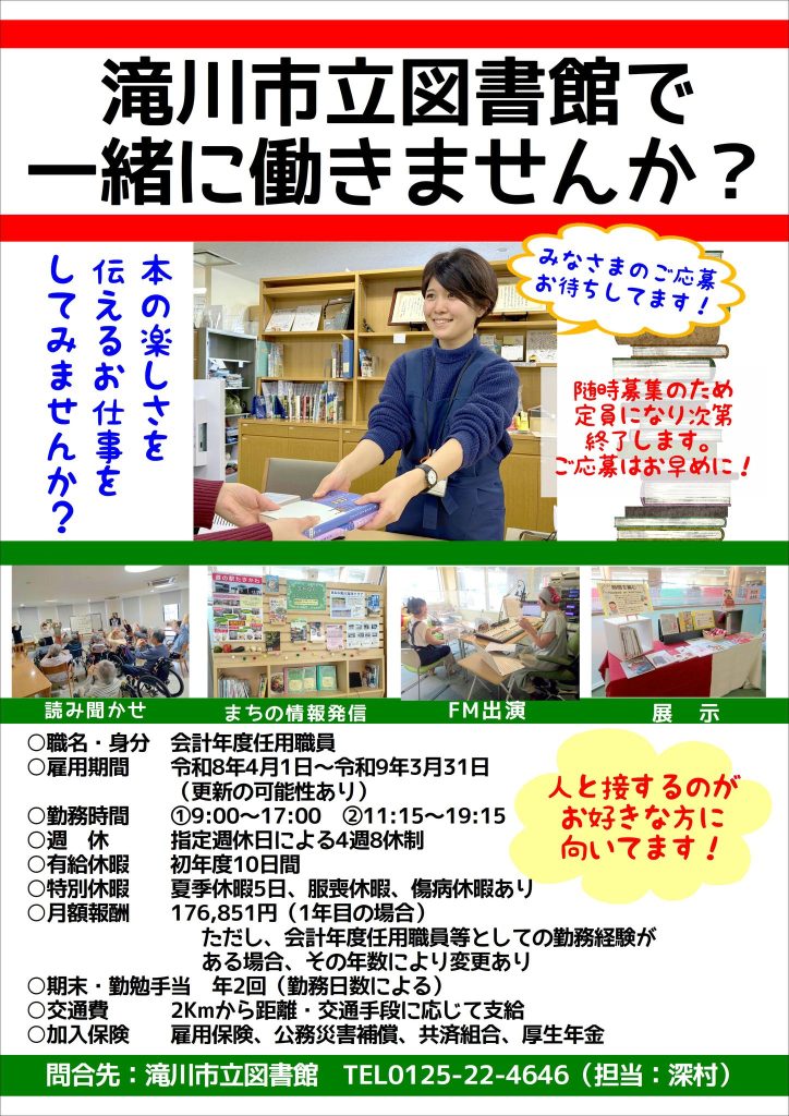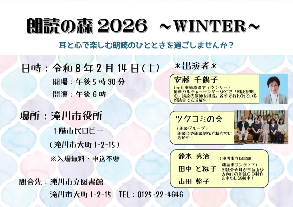 2026年1月31日 2025年度お知らせ ***滝川市立図書館で一緒に働きませんか?*** 2026年1月31日 2025年度イベント 朗読の森2026~WINTER~ 2026年1月27日 2025年度イベント 2026年版カレンダーリサイクル展 2026年1月22日 2025年度お知らせ展示 2月展示「時間を編む~Hooked on knitting~」ほか 2026年1月22日 まちなかコンシェルジュ_団体サークル編 No.73 BB2Hクラブ 2026年1月17日 2025年度イベントお知らせこども 生きる力を育むたきかわっ子ワクワクまなびプログラム「としょかん☆ワクワクゲームDAY2026 in 興禅寺」 2026年1月17日 2025年度イベントお知らせこども スターバックスコーヒーTSUTAYA BOOKSTORE滝川店・TSUTAYA BOOKSTORE滝川店・滝川市立図書館連携事業 BOOK&CAFE VOL.1 出張えほんとあそぼう!「おはなしのひろば」 2026年1月17日 2025年度イベント 2026年版カレンダーリサイクル展 2026年1月7日 ランキング 予約ランキング 1 2 » 展示 連携の取り組み 雑誌ささえ隊 まちなかコンシェルジュ ランキング こんなとき読みたい3冊 おすすめの本 ポスターチラシ掲示板
